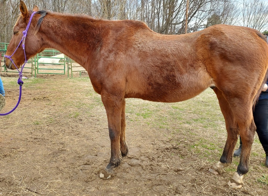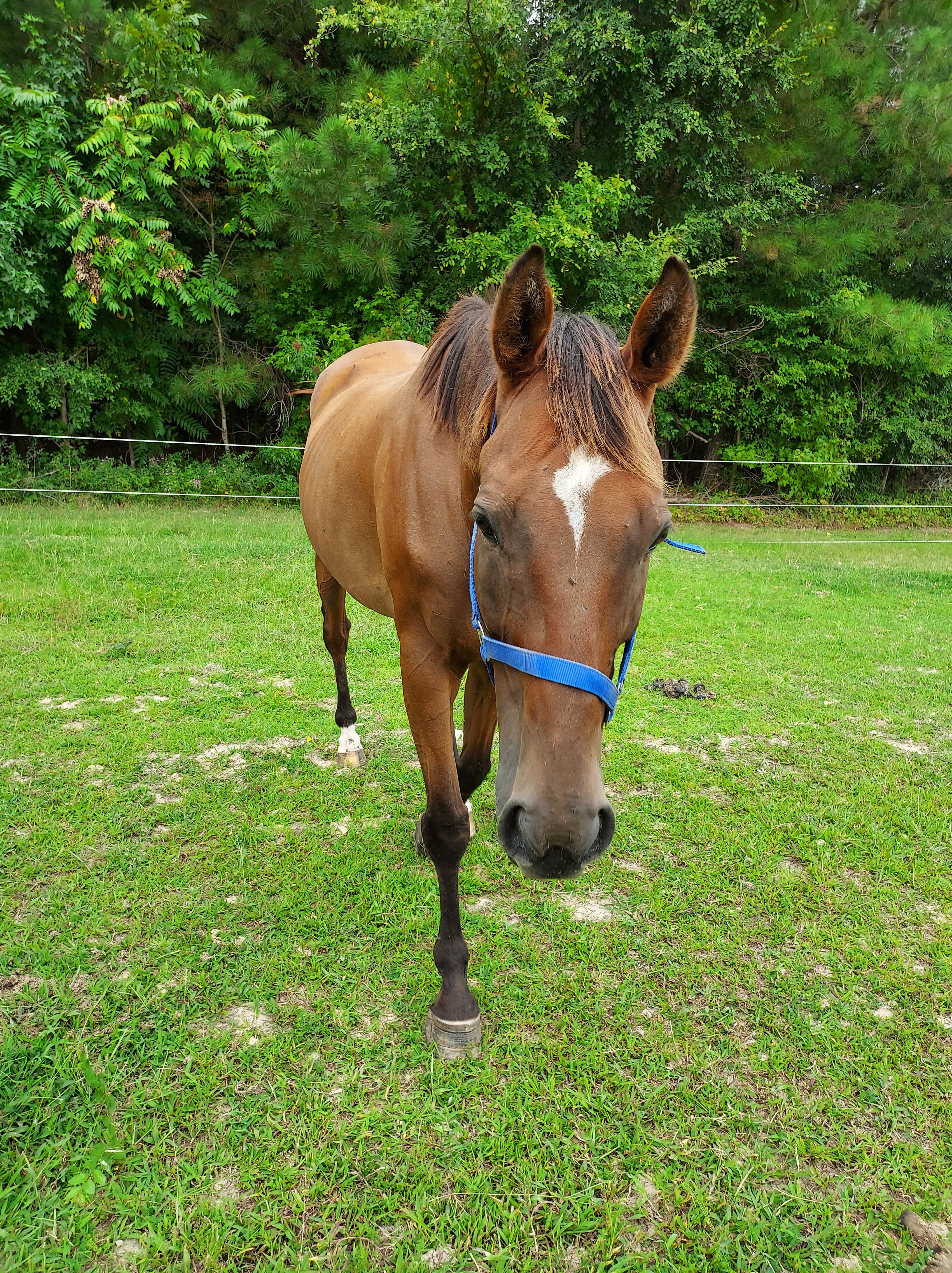 Griffy was rescued at auction and seemed sore on his front feet. He promptly tore off HALF of his right front hoof – he will need specialty care and a full year to regrow the foot.
