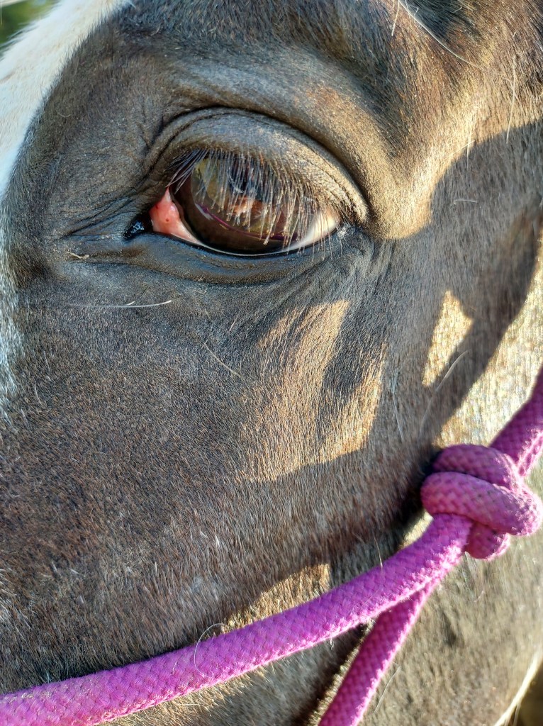 Update: Ace has a suspicious bump in his left eye which we suspect is “cancer eye”. He now stands for the farrier without issue and is even learning how to be hotshod!