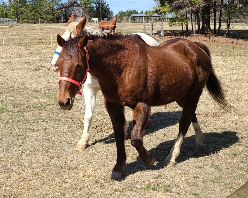 Cinnamon is very calm, gentle and easy to handle. She stands well for the vet and farrier and loads with encouragement. She has been ridden in the past but should not be under saddle until she regains weight.