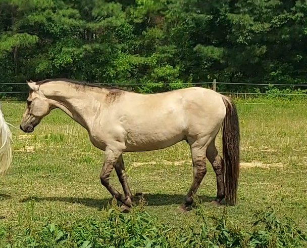 ZEPHYR came in with Griffy and Zeus, rescued at auction and infected with the very contagious Strangles disease. After several months of quarantine and healing, we began retraining her and gaining her trust as she built up strength and muscle. She entered the lesson program and was a safe, steady partner for nearly a year. We taught her to ride bitless AND bridleless, with a special halting trick. As it became clear she preferred being a trail horse to working in the arena we then listed her for adoption and she found a great home – but her owner’s circumstances changed and she came back to find another forever family!