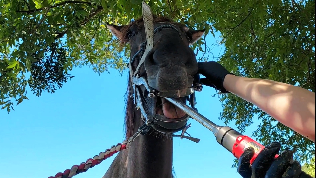 ZIGGY was by far our most emaciated horse yet when we picked him up. You could see all his bones even under a thick winter coat! He was over 30 and a cribber so most of his teeth were missing, including ALL his top front teeth. Starving because he couldn’t chew properly, we got his few remaining teeth floated and began feeding him soaked meals every 4 hours. He put on nearly 100 lbs in his first month! Ziggy is also almost completely blind and deaf so he is currently with us as a Sanctuary horse since he requires extra care.